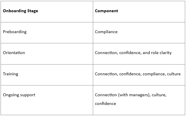 - A good onboarding program includes preboarding, orientation, training, and ongoing support. Each stage fulfills the 5 onboarding elements: culture, compliance, connection, confidence, and clarity.